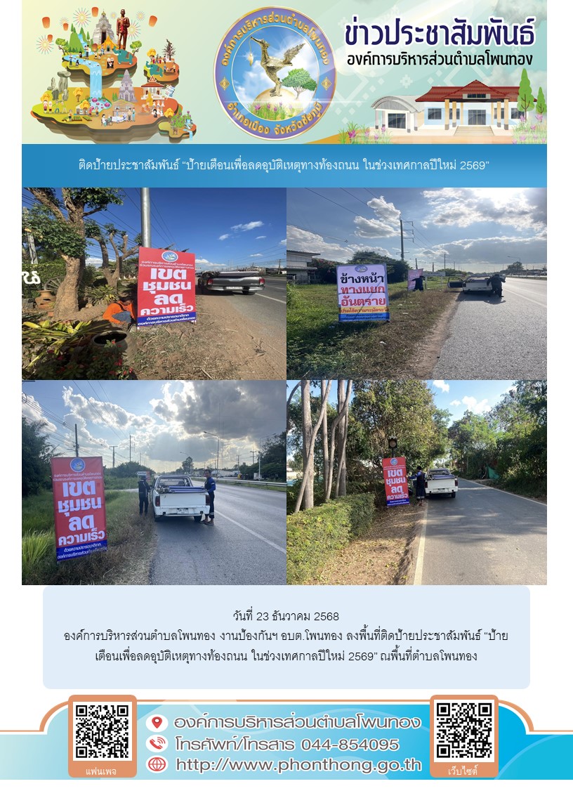 วันที่ 23 ธันวาคม 2568 องค์การบริหารส่วนตำบลโพนทอง งานป้องกันฯ อบต.โพนทอง ลงพื้นที่ติดป้ายประชาสัมพันธ์ “ป้ายเตือนเพื่อลดอุบัติเหตุทางท้องถนน ในช่วงเทศกาลปีใหม่ 2569” ณพื้นที่ตำบลโพนทอง
