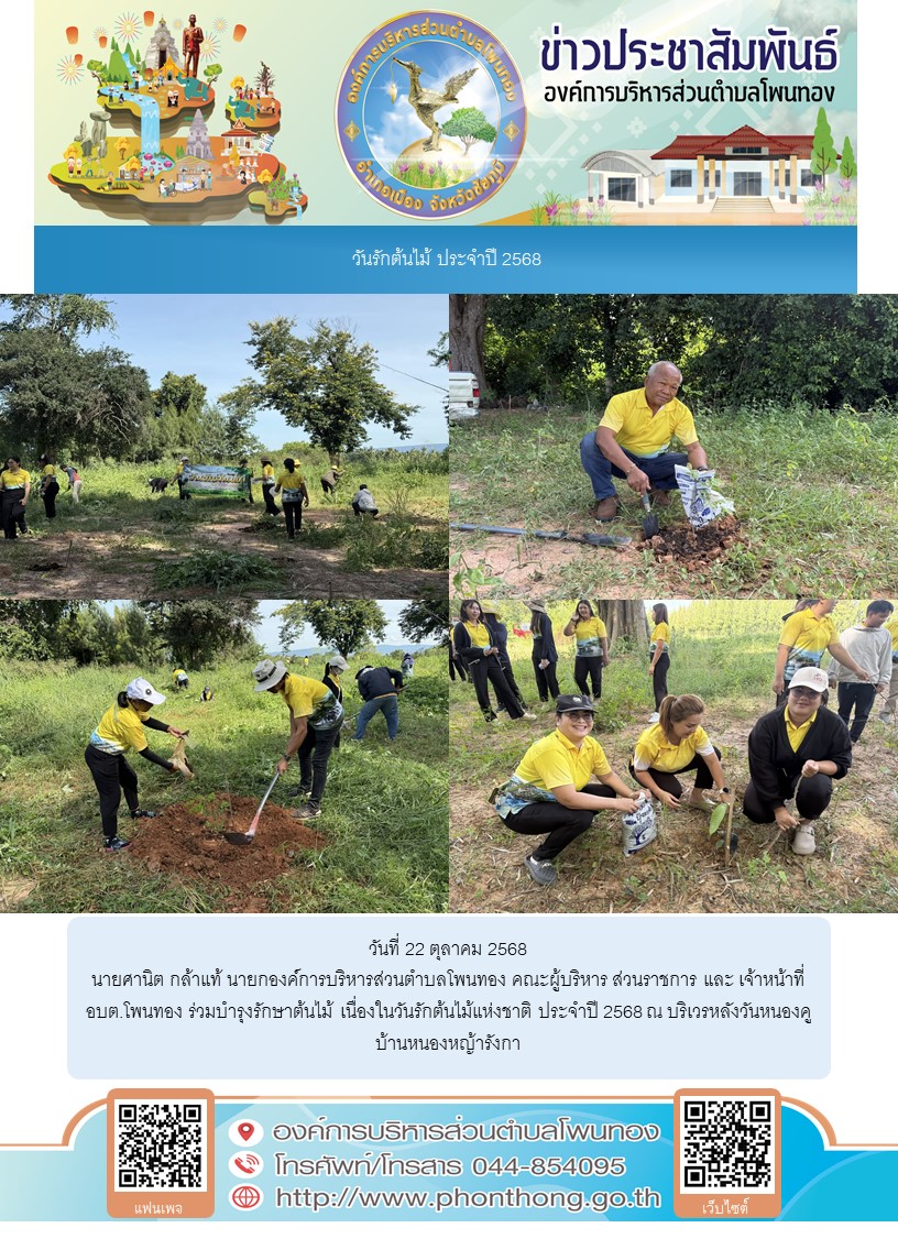 วันที่ 22 ตุลาคม 2568 นายศานิต กล้าแท้ นายกองค์การบริหารส่วนตำบลโพนทอง คณะผู้บริหาร ส่วนราชการ และ เจ้าหน้าที่ อบต.โพนทอง ร่วมบำรุงรักษาต้นไม้ เนื่องในวันรักต้นไม้แห่งชาติ ประจำปี 2568 ณ บริเวรหลังวันหนองคู บ้านหนองหญ้ารังกา