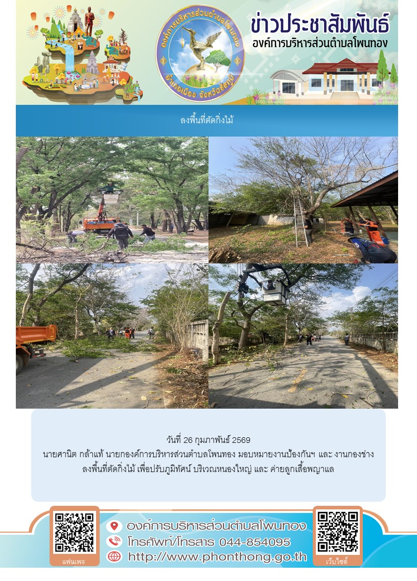 วันที่ 26 กุมภาพันธ์ 2569 นายศานิต กล้าแท้ นายกองค์การบริหารส่วนตำบลโพนทอง มอบหมายงานป้องกันฯ และ งานกองช่าง ลงพื้นที่ตัดกิ่งไม้ เพื่อปรับภูมิทัศน์ บริเวณหนองใหญ่ และ ค่ายลูกเสื้อพญาแล
