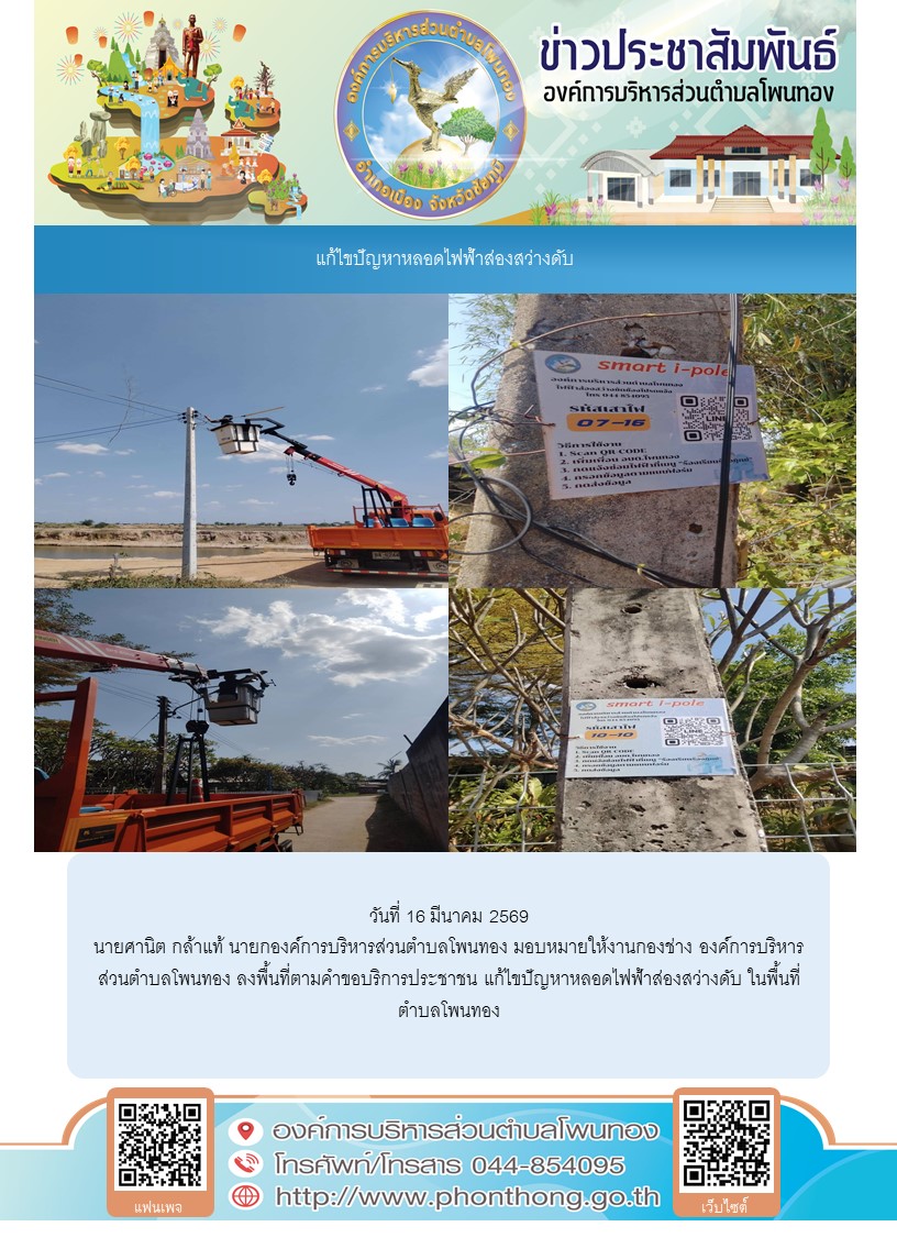 วันที่ 16 มีนาคม 2569 นายศานิต กล้าแท้ นายกองค์การบริหารส่วนตำบลโพนทอง มอบหมายให้งานกองช่าง องค์การบริหารส่วนตำบลโพนทอง ลงพื้นที่ตามคำขอบริการประชาชน แก้ไขปัญหาหลอดไฟฟ้าส่องสว่างดับ ในพื้นที่ตำบลโพนทอง
