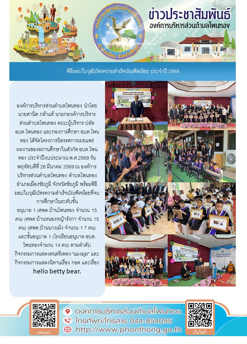 องค์การบริหารส่วนตำบลโพนทอง นำโดย นายศานิต กล้าแท้ นายกองค์การบริหารส่วนตำบลโพนทอง คณะผู้บริหาร ปลัด อบต.โพนทอง และกองการศึกษา อบต.โพนทอง ได้จัดโครงการนิทรรศการเผยแพร่ผลงานของสถานศึกษาในสังกัด อบต.โพนทอง ประจำปีงบประมาณ พ.ศ.2569 วันพฤหัสบดีที่ 26 มีนาคม 2569 ณ องค์การบริหารส่วนตำบลโพนทอง ตำบลโพนทอง อำเภอเมืองชัยภูมิ จังหวัดชัยภูมิ พร้อมพิธีมอบใบวุฒิบัตรความสำเร็จบัณฑิตน้อยที่จบการศึกษาในระดับชั้น