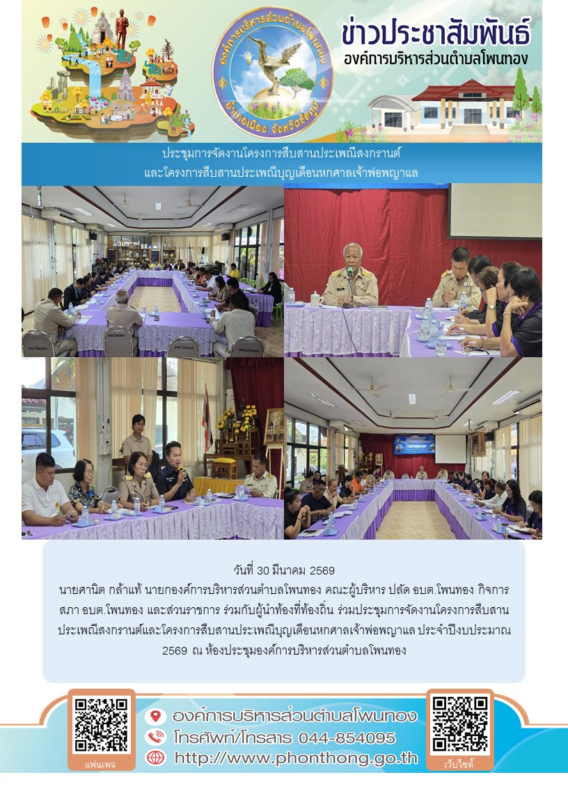 นายศานิต กล้าแท้ นายกองค์การบริหารส่วนตำบลโพนทอง คณะผู้บริหาร ปลัด อบต.โพนทอง กิจการสภา อบต.โพนทอง และส่วนราชการ ร่วมกับผู้นำท้องที่ท้องถิ่น ร่วมประชุมการจัดงานโครงการสืบสานประเพณีสงกรานต์และโครงการสืบสานประเพณีบุญเดือนหกศาลเจ้าพ่อพญาแล ประจำปีงบประมาณ 2569 ณ ห้องประชุมองค์การบริหารส่วนตำบลโพนทอง