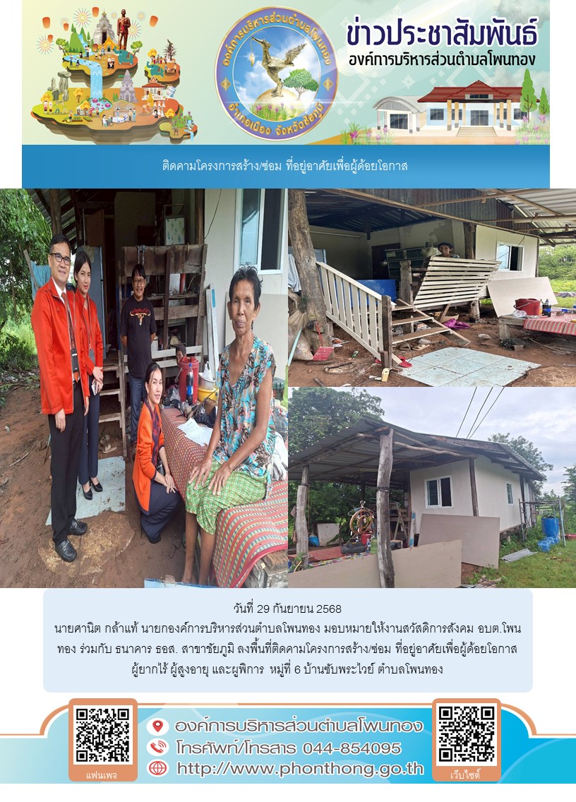 นายศานิต กล้าแท้ นายกองค์การบริหารส่วนตำบลโพนทอง มอบหมายให้งานสวัสดิการสังคม อบต.โพนทอง ร่วมกับ ธนาคาร ธอส. สาขาชัยภูมิ ลงพื้นที่ติดคามโครงการสร้าง/ซ่อม ที่อยู่อาศัยเพื่อผู้ด้อยโอกาส ผู้ยากไร้ ผู้สูงอายุ และผูพิการ หมู่ที่ 6 บ้านซับพระไวย์ ตำบลโพนทอง