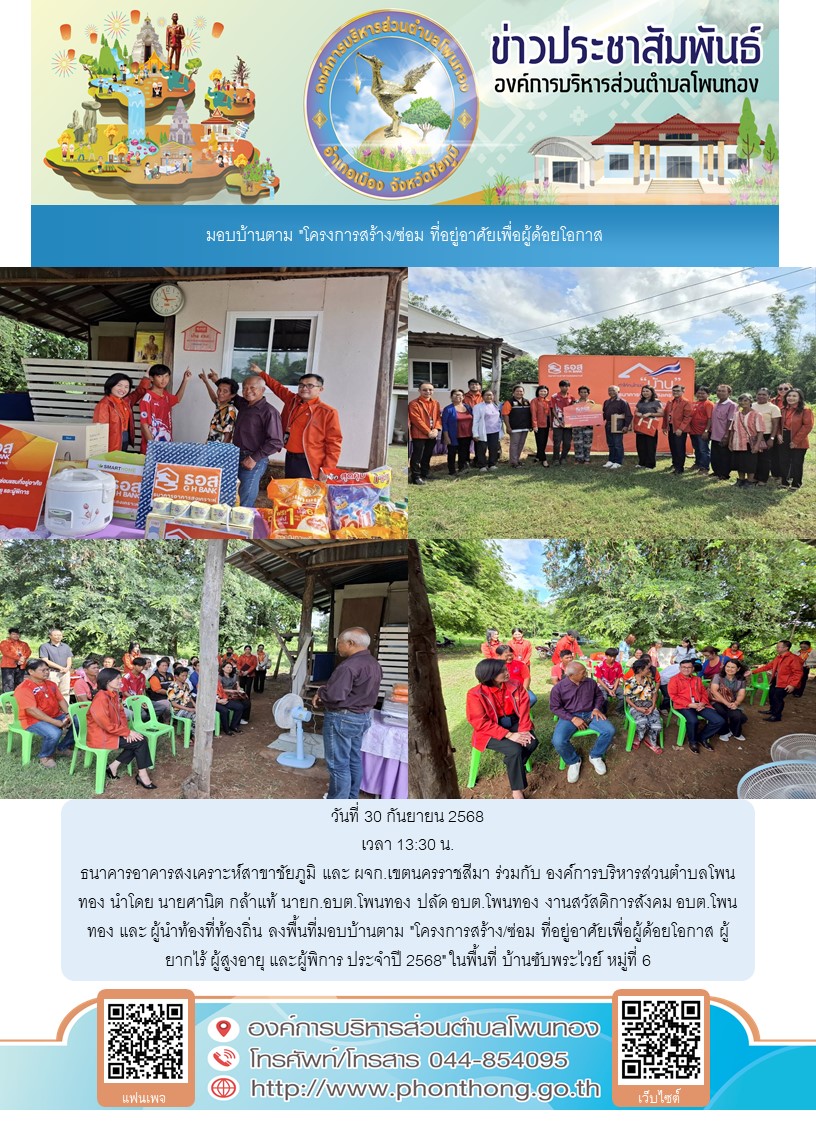 ธนาคารอาคารสงเคราะห์สาขาชัยภูมิ และ ผจก.เขตนครราชสีมา ร่วมกับ องค์การบริหารส่วนตำบลโพนทอง นำโดย นายศานิต กล้าแท้ นายก.อบต.โพนทอง ปลัด อบต.โพนทอง งานสวัสดิการสังคม อบต.โพนทอง และ ผู้นำท้องที่ท้องถิ่น ลงพื้นที่มอบบ้านตาม "โครงการสร้าง/ซ่อม ที่อยู่อาศัยเพื่อผู้ด้อยโอกาส ผู้ยากไร้ ผู้สูงอายุ และผู้พิการ ประจำปี 2568" ในพื้นที่ บ้านซับพระไวย์ หมู่ที่ 6
