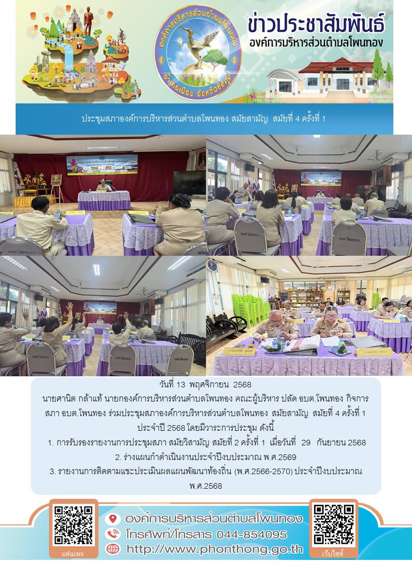 นายศานิต กล้าแท้ นายกองค์การบริหารส่วนตำบลโพนทอง คณะผู้บริหาร ปลัด อบต.โพนทอง กิจการสภา อบต.โพนทอง ร่วมประชุมสภาองค์การบริหารส่วนตำบลโพนทอง สมัยสามัญ สมัยที่ 4 ครั้งที่ 1 ประจำปี 2568 โดยมีวาระการประชุม ดังนี้
