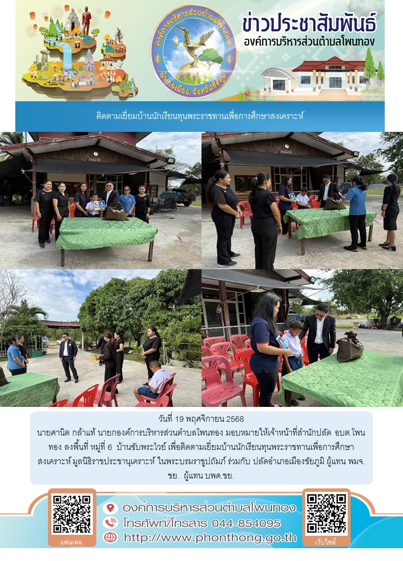 นายศานิต กล้าแท้ นายกองค์การบริหารส่วนตำบลโพนทอง มอบหมายให้เจ้าหน้าที่สำนักปลัด อบต.โพนทอง ลงพื้นที่ หมู่ที่ 6 บ้านซับพระไวย์ เพื่อติดตามเยี่ยมบ้านนักเรียนทุนพระราชทานเพื่อการศึกษาสงเคราะห์ มูลนิธิราชประชานุเคราะห์ ในพระบรมราชูปถัมภ์ ร่วมกับ ปลัดอำเภอเมืองชัยภูมิ ผู้แทน พมจ.ชย. ผู้แทน บพด.ชย.