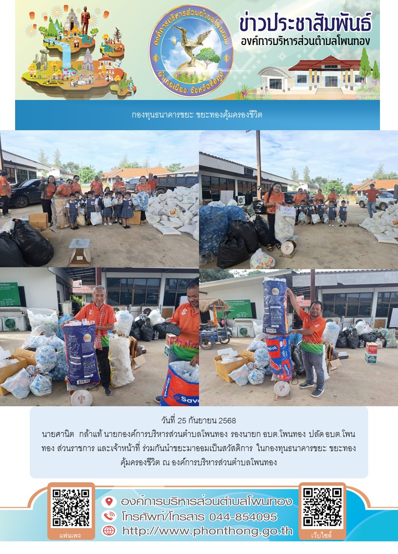 วันที่ 25 กันยายน 2568 นายศานิต กล้าแท้ นายกองค์การบริหารส่วนตำบลโพนทอง รองนายก อบต.โพนทอง ปลัด อบต.โพนทอง ส่วนราชการ และเจ้าหน้าที่ ร่วมกันนำขยะมาออมเป็นสวัสดิการ ในกองทุนธนาคารขยะ ขยะทองคุ้มครองชีวิต ณ องค์การบริหารส่วนตำบลโพนทอง