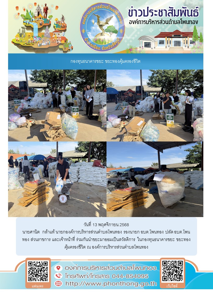 วันที่ 13 พฤศจิกายน 2568 นายศานิต กล้าแท้ นายกองค์การบริหารส่วนตำบลโพนทอง รองนายก อบต.โพนทอง ปลัด อบต.โพนทอง ส่วนราชการ และเจ้าหน้าที่ ร่วมกันนำขยะมาออมเป็นสวัสดิการ ในกองทุนธนาคารขยะ ขยะทองคุ้มครองชีวิต ณ องค์การบริหารส่วนตำบลโพนทอง