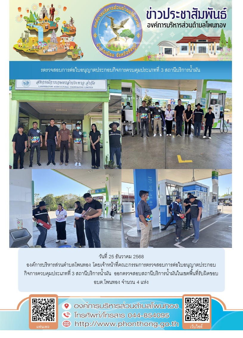 วันที่ 25 ธันวาคม 2568 องค์การบริหารส่วนตำบลโพนทอง โดยเจ้าหน้าที่คณะกรรมการตรวจสอบการต่อใบอนุญาตประกอบกิจการควบคุมประเภทที่ 3 สถานีบริการน้ำมัน ออกตรวจสอบสถานีบริการน้ำมันในเขตพื้นที่รับผิดชอบ อบต.โพนทอง จำนวน 4 แห่ง