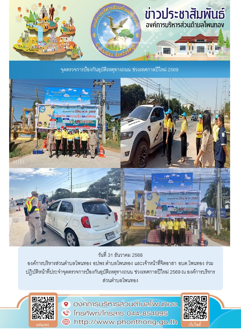 วันที่ 31 ธันวาคม 2568 องค์การบริหารส่วนตำบลโพนทอง อปพร.ตำบลโพนทอง และเจ้าหน้าที่จิตอาสา อบต.โพนทอง ร่วมปฏิบัติหน้าที่ประจำจุดตรวจการป้องกันอุบัติเหตุทางถนน ช่วงเทศกาลปีใหม่ 2569 ณ องค์การบริหารส่วนตำบลโพนทอง