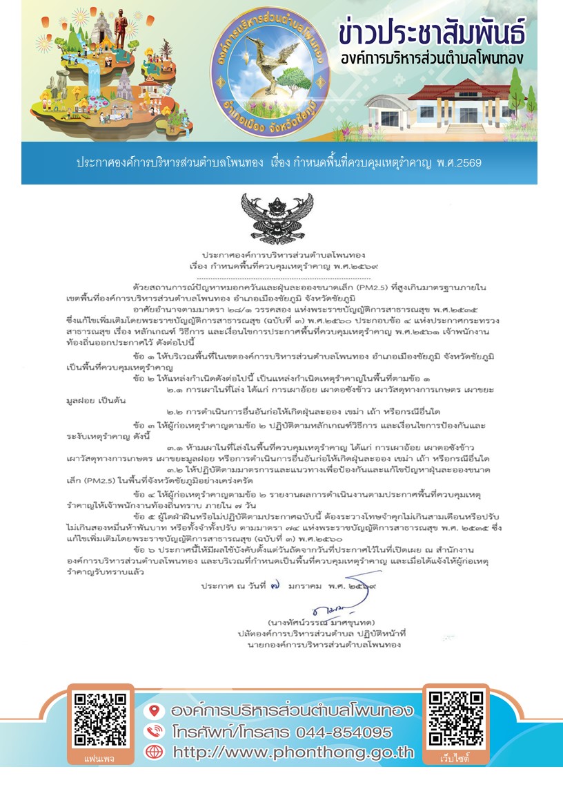 ประกาศองค์การบริหารส่วนตำบลโพนทอง เรื่อง กำหนดพื้นที่ควบคุมเหตุรำคาญ พ.ศ.2569