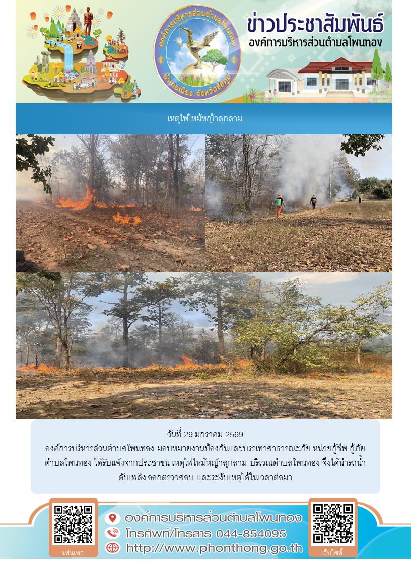 วันที่ 29 มกราคม 2569 องค์การบริหารส่วนตำบลโพนทอง มอบหมายงานป้องกันและบรรเทาสาธารณะภัย หน่วยกู้ชีพ กู้ภัยตำบลโพนทอง ได้รับแจ้งจากประชาชน เหตุไฟไหม้หญ้าลุกลาม บริเวณตำบลโพนทอง จึงได้นำรถน้ำดับเพลิง ออกตรวจสอบ และระงับเหตุได้ในเวลาต่อมา