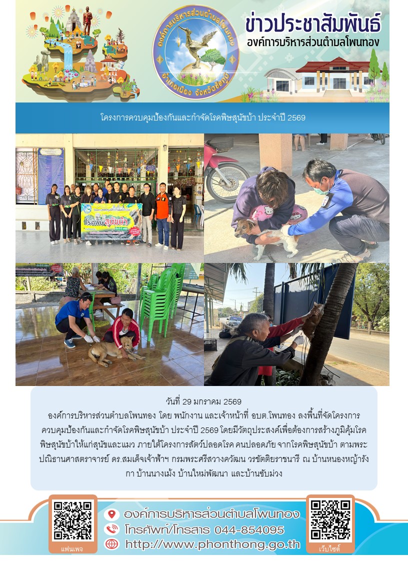 องค์การบริหารส่วนตำบลโพนทอง โดย พนักงาน และเจ้าหน้าที่ อบต.โพนทอง ลงพื้นที่จัดโครงการควบคุมป้องกันและกำจัดโรคพิษสุนัขบ้า ประจำปี 2569 โดยมีวัตถุประสงค์เพื่อต้องการสร้างภูมิคุ้มโรคพิษสุนัขบ้าให้แก่สุนัขและแมว ภายใต้โครงการสัตว์ปลอดโรค คนปลอดภัย จากโรคพิษสุนัขบ้า ตามพระปณิธานศาสตราจารย์ ดร.สมเด็จเจ้าฟ้าฯ กรมพระศรีสวางควัฒน วรขัตติยราชนารี ณ บ้านหนองหญ้ารังกา บ้านนางเม้ง บ้านใหม่พัฒนา และบ้านซับม่วง