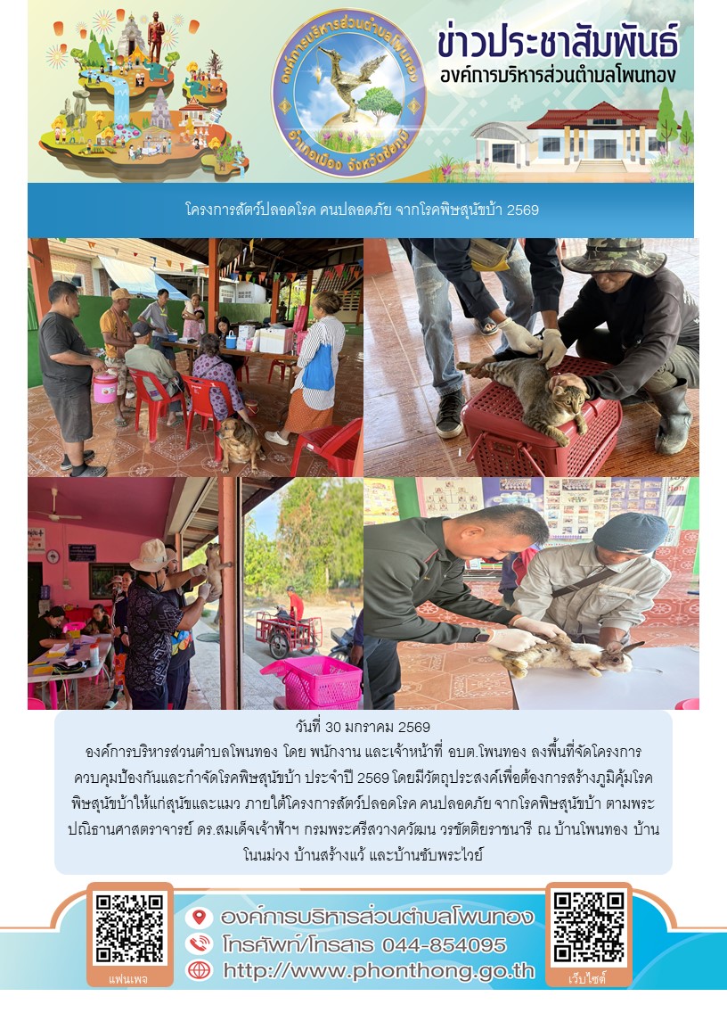องค์การบริหารส่วนตำบลโพนทอง โดย พนักงาน และเจ้าหน้าที่ อบต.โพนทอง ลงพื้นที่จัดโครงการควบคุมป้องกันและกำจัดโรคพิษสุนัขบ้า ประจำปี 2569 โดยมีวัตถุประสงค์เพื่อต้องการสร้างภูมิคุ้มโรคพิษสุนัขบ้าให้แก่สุนัขและแมว ภายใต้โครงการสัตว์ปลอดโรค คนปลอดภัย จากโรคพิษสุนัขบ้า ตามพระปณิธานศาสตราจารย์ ดร.สมเด็จเจ้าฟ้าฯ กรมพระศรีสวางควัฒน วรขัตติยราชนารี ณ บ้านโพนทอง บ้านโนนม่วง บ้านสร้างแว้ และบ้านซับพระไวย์